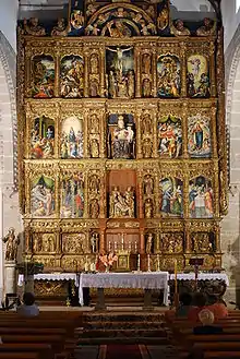 À noter le retable principal, de même largeur et hauteur que la nef centrale. Il s'agit d'une œuvre de la Renaissance du XVIe siècle, commencée en 1525. Il repose sur un socle et le tout est sculpté en bois, polychrome, et se compose de trois voies verticales. Dans la bande centrale se trouve la sculpture polychrome de la Vierge en majesté (Santa María del Castillo), et dessus un relief Renaissance représentant un calvaire. La scène a de nombreux personnages sculptés avec tellement de volume qu'ils ressemblent à des sculptures autoportantes plutôt qu'à un relief. Les bandes latérales présentent d'excellentes peintures sur toile, de style Renaissance, liées aux ateliers d'Àvila du XVIe siècle, leurs auteurs étant Diego de Rosales et son fils Gabriel Rosales.