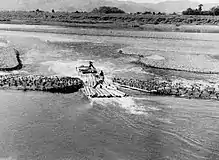 Le transport de marchandises sur l’eau par radeaux, barques et bateaux est très ancien, mais aussi grâce à divers objets servant de flotteur, c'est-à-dire d'élément assurant la flottabilité. Cette très ancienne méthode de transport par des peaux d’animaux gonflées ou des gourdes de cuir (jāla en persan[14], taraṇḍ en ourdou[15]) ou grâce à des jarres ou poteries inversées (les ćau-ghaṛā en ourdou et hindi classique, les āluḥ en sanskrit[16]) en guise de bouées est déjà représentée sur des bas-reliefs assyriens du VIIe siècle av. J.-C. Aucune fouille archéologique n’a pu confirmer cette pratique jusqu’à ce jour. On retrouve néanmoins des pratiques similaires aujourd’hui en Chine, en Afghanistan ou au Pakistan. On utilise également des pièces de bois ou des jerricans d’essence[17].