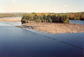 Vue aérienne d’une flotte avec estacade flottante sur le fleuve Sainte-Croix.