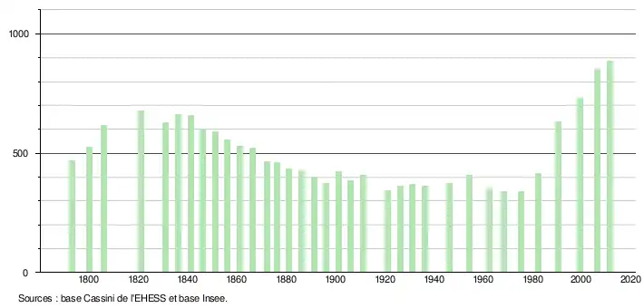 L'évolution du nombre d'habitants est connue à travers les recensements de la population effectués dans la commune depuis 1793. À partir du , les populations légales des communes sont publiées annuellement dans le cadre d'un recensement qui repose désormais sur une collecte d'information annuelle, concernant successivement tous les territoires communaux au cours d'une période de cinq ans. Pour les communes de moins de 10 000 habitants, une enquête de recensement portant sur toute la population est réalisée tous les cinq ans, les populations légales des années intermédiaires étant quant à elles estimées par interpolation ou extrapolation[10]. Pour la commune, le premier recensement exhaustif entrant dans le cadre du nouveau dispositif a été réalisé en 2007[11],[Note 2].