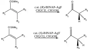 Une autre méthode de synthèse organique utilisant le fluorure d'argent(I) est la protonation énantiosélective d'éther de silylénol catalysée par le complexe BINAP-AgF[22] : :1546