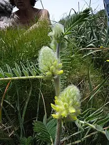 - Astragalus alopecurus est une plante vivace de grande taille, qui fleurit en juin. Les fleurs jaunes sont regroupées en épis couverts de poils qui lui donnent un aspect blanchâtre.