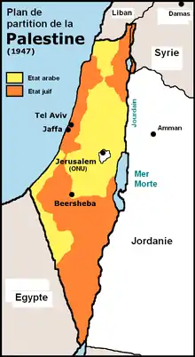 Le un plan de partage de la Palestine voté par l'assemblée générale de l'ONU prévoit à la fois la création d'un État juif, d'un État arabe et d'une zone internationale à Jérusalem et à Bethléem en Palestine alors administrée par les Britanniques. Entre décembre 1947 et mai 1948, un état de guerre larvé et de très nombreux incidents éclatent et font des milliers de victimes par mort ou par blessure entre Juifs et Arabes en Palestine (cf Guerre israélo-arabe de 1948).
