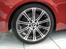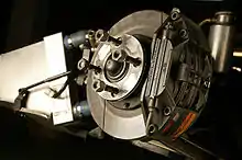 - Dans le cas des freins à disque, des plaquettes sont serrées sur les deux faces d'un disque par un ou plusieurs pistons hydrauliques. Le disque est auto-ventilé sur les véhicules sollicitant beaucoup les freins[23].