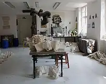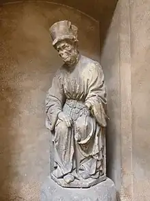 Les tailleurs de pierre (steinmetz) constituent le gros du personnel technique de l’Œuvre : une trentaine lors de l’édification de la haute tour, probablement le double lors de celle de la façade ; à l’approche de l’achèvement de la flèche en 1439, leur nombre diminue progressivement et oscille par la suite entre quatre et neuf selon les périodes[24]. À Strasbourg, les tailleurs de pierre sont payés à la journée (taglohn) et touchent tous le même salaire de base, auquel s’ajoute éventuellement des suppléments pour ceux qui effectuent des tâches hautement qualifiées, comme le parlier déjà évoqué, l’appareilleur (setzer), un spécialiste de la pose des pierres et des coulages au plomb, ou encore le sculpteur d’ornement (laubhauer)[24]. Les tailleurs de pierre sont assistés par les valets de l’atelier (hüttenknecht), qui leur apportent leurs outils, nettoient l’atelier ou encore déplacent les blocs[25]. Parmi ceux-ci, les valets du treuil ont spécifiquement la charge d’actionner les grues du chantier, ils jouissent d’une rémunération plus élevée du fait de la difficulté de la tâche[26].