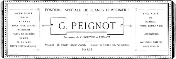 - Gustave Peignot (dir.), Spécimen, Paris, Fonderie spéciale de blancs et de filets, , In-8 (245 × 160 mm) ; huit parties : filets, divers, caractères pour le labeur, caractères pour journaux, caractères variés, fantaisies diverses, vignettes et coins, affiches.