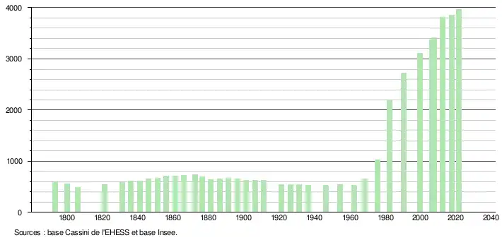L'évolution du nombre d'habitants est connue à travers les recensements de la population effectués dans la commune depuis 1793. Pour les communes de moins de 10 000 habitants, une enquête de recensement portant sur toute la population est réalisée tous les cinq ans, les populations légales des années intermédiaires étant quant à elles estimées par interpolation ou extrapolation[28]. Pour la commune, le premier recensement exhaustif entrant dans le cadre du nouveau dispositif a été réalisé en 2007[29].