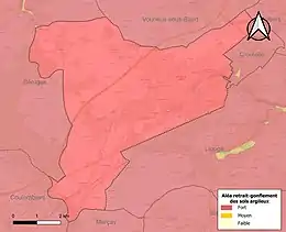 Les mouvements de terrains susceptibles de se produire sur la commune sont des affaissements et effondrements liés aux cavités souterraines (hors mines) et des tassements différentiels[20]. Afin de mieux appréhender le risque d’affaissement de terrain, un inventaire national permet de localiser les éventuelles cavités souterraines sur la commune[21]. Le retrait-gonflement des sols argileux est susceptible d'engendrer des dommages importants aux bâtiments en cas d’alternance de périodes de sécheresse et de pluie[22]. La totalité de la commune est en aléa moyen ou fort (79,5 % au niveau départemental et 48,5 % au niveau national)[Carte 2]. Depuis le , en application de la loi ÉLAN, différentes contraintes s'imposent aux vendeurs, maîtres d'ouvrages ou constructeurs de biens situés dans une zone classée en aléa moyen ou fort[Note 3],[23].