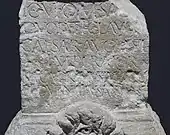 L'inscription se lit de la façon suivante : Iovi O(ptimo) M(aximo) sa[crum] / quod Ti(berius) Claud(ius) / Caesar Aug(ustus) est / Imperator / M(arcus) Caprilius Luc[3]u[s] / Ti(berius) Dubnatius Aed[3][6],[3]. Les épigraphistes hésitent sur la lecture du dernier mot où trois lettres ont disparu : Aeduus ou bien Aedif(icavit).