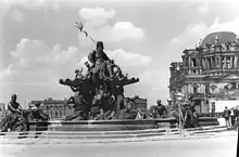 La fontaine, protégée par une maçonnerie en 1942, a survécu indemne à la Seconde Guerre mondiale. Après sa remise au jour en 1946, des voleurs de métaux non-ferreux ont endommagé les personnages. Après le dynamitage du château, qui a causé d'autres dommages à la fontaine, les personnages ont été entreposés en 1951 et le bassin en marbre suédois rouge poli, qui avait précédemment servi de miroir, a été détruit[3]. En 1969, la fontaine a été déplacée entre la Marienkirche et le Rothes Rathaus, au parc de la Fernsehturm (de), construit à la place du Marienviertel (de) détruit pendant la Seconde Guerre mondiale[4]. Auparavant, le sculpteur Hans Füssel et la fonderie d'art et de cloches Lauchhammer (de) avaient restauré les figures en 1967[5]. Le nouveau bassin de la fontaine est fait de granite rouge Jawlensker (de Transbaïkalie), les marches extérieures de granite gris. Après son repositionnement, elle a été appelée « fontaine de Neptune », niant son emplacement historique.