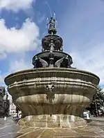 Composée de trois bassins, le premier en granit, les deux autres en plomb, la fontaine est surmontée d’une statue dans laquelle certains reconnaissent une Vierge florentine et d’autres la déesse celtique Anna.