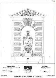 Comme pour les fontaines de Mars et du Fellah, c'est Pierre-Nicolas Beauvallet, un élève de Pajou, qui fut chargé de réaliser le décor sculptural de celle de la pointe Saint-Eustache.