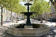 - La fontaine Morel, ou des Quatre Saisons, se situe en bas du cours de la République, sur l'Avenue de la Liberté. Réalisée par les architectes Bedos et Chaffard et par le sculpteur Chauvet, elle est érigée en 1862 en l'honneur de François Morel[8], ancien maire de la ville (1832-1853), et Alfred-Henri Morel, maire (1853-1859). Cette fontaine à plan centré à bassin circulaire est ornée d'un pilier cantonné de quatre putti symbolisant les saisons et chevauchant des dauphins, surmonté d'un buste du maire Morel.