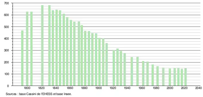 L'évolution du nombre d'habitants est connue à travers les recensements de la population effectués dans la commune depuis 1793. Pour les communes de moins de 10 000 habitants, une enquête de recensement portant sur toute la population est réalisée tous les cinq ans, les populations légales des années intermédiaires étant quant à elles estimées par interpolation ou extrapolation[13]. Pour la commune, le premier recensement exhaustif entrant dans le cadre du nouveau dispositif a été réalisé en 2006[14].