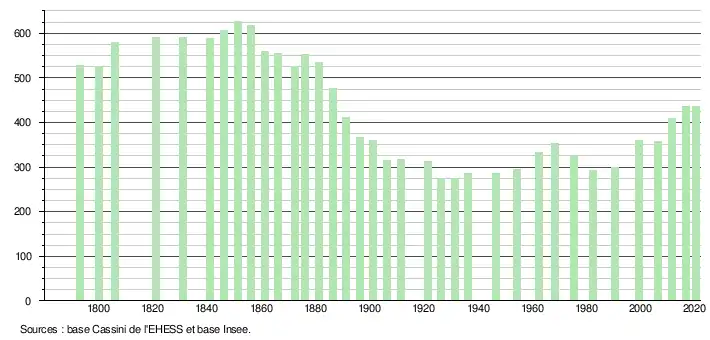 L'évolution du nombre d'habitants est connue à travers les recensements de la population effectués dans la commune depuis 1793. Pour les communes de moins de 10 000 habitants, une enquête de recensement portant sur toute la population est réalisée tous les cinq ans, les populations légales des années intermédiaires étant quant à elles estimées par interpolation ou extrapolation[34]. Pour la commune, le premier recensement exhaustif entrant dans le cadre du nouveau dispositif a été réalisé en 2006[35].