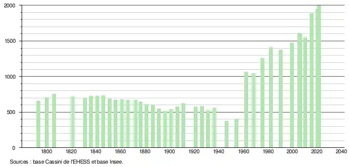 L'évolution du nombre d'habitants est connue à travers les recensements de la population effectués dans la commune depuis 1793. Pour les communes de moins de 10 000 habitants, une enquête de recensement portant sur toute la population est réalisée tous les cinq ans, les populations légales des années intermédiaires étant quant à elles estimées par interpolation ou extrapolation[24]. Pour la commune, le premier recensement exhaustif entrant dans le cadre du nouveau dispositif a été réalisé en 2005[25].