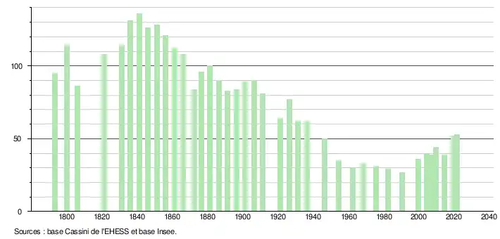 L'évolution du nombre d'habitants est connue à travers les recensements de la population effectués dans la commune depuis 1793. Pour les communes de moins de 10 000 habitants, une enquête de recensement portant sur toute la population est réalisée tous les cinq ans, les populations légales des années intermédiaires étant quant à elles estimées par interpolation ou extrapolation[16]. Pour la commune, le premier recensement exhaustif entrant dans le cadre du nouveau dispositif a été réalisé en 2004[17].