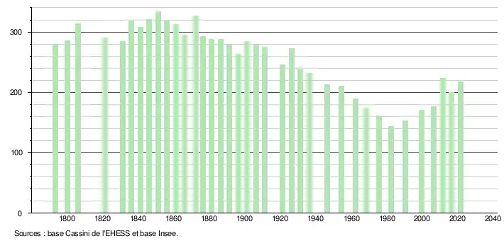 L'évolution du nombre d'habitants est connue à travers les recensements de la population effectués dans la commune depuis 1793. Pour les communes de moins de 10 000 habitants, une enquête de recensement portant sur toute la population est réalisée tous les cinq ans, les populations légales des années intermédiaires étant quant à elles estimées par interpolation ou extrapolation[11]. Pour la commune, le premier recensement exhaustif entrant dans le cadre du nouveau dispositif a été réalisé en 2006[12].