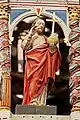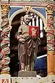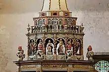La corniche compte seize statues au drapé mouvementé. Au-dessus, un premier lanternon abrite le Baptême du Christ, et le second, un ange aux ailes déployées.
