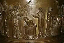 La cuve est le point de rencontre des influences grecque, byzantine et mosane. On remarque que les êtres purificateurs et précurseurs sont d'une taille supérieure ; les personnages sont au nombre de 20 et représentés selon le procédé de la frise romaine telle qu'on la retrouve sur la colonne de Trajan, à Rome.