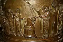 Le Christ est plongé nu-corps dans le Jourdain ; il est le seul personnage de face de la cuve. Avec sa main droite, il fait le signe de la Trinité. Au-dessus de lui, Dieu est représenté par une tête de vieillard nimbée, inclinée vers Jésus et entourée d'un nuage figuré par une moulure semi-circulaire d'où surgissent des rayons. En signe de respect, les anges se cachent les mains sous un linge qu'ils tendent au Christ.