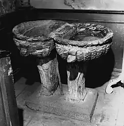 Base Palissy : « Fonts baptismaux comprenant deux bassins à flancs godronnés. Les piliers de support sont ornés de cannelures et de motifs divers. »