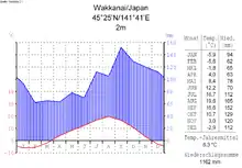Le climat est continental et humide à étés chauds avec une température moyenne annuelle de 5 °C, variant entre 22 °C pour le mois le plus chaud et −13 °C pour le plus froid[2]. À Wakkanai, à la pointe nord-ouest de l'île en face de Sakhaline, la température moyenne en janvier varie de -7 à −10 °C. L'ensoleillement hivernal varie entre 39 h en janvier à Wakkanai et 178 h à Nemuro, à la pointe nord-est[3].