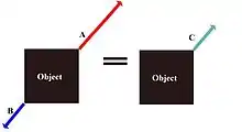 Vecteurs en sens opposées. L'illustration suppose que l'objet, en l'occurrence un carré, n'a pas de centre de masse et peut être traité comme un point.