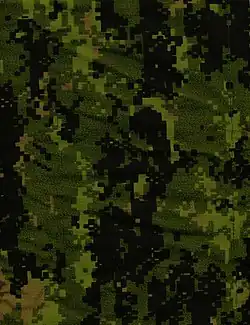 L'uniforme de champ est composé de motifs de camouflage vert appelés « dessin de camouflage canadien » ou D Cam CMD. Celui-ci a commencé à être distribué à l'armée de terre en 2002 ; avant cette date, un uniforme de combat vert olive était porté[37]. Une version beige du même uniforme existe pour les opérations se déroulant dans un environnement désertique comme en Afghanistan. La marine possède son propre uniforme de combat qui est composé d'une chemise bleue et d'un pantalon noir. De son côté, l'aviation utilise un uniforme de vol vert en plus de l'uniforme de combat au D Cam CMD.