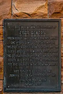 Cette plaque sur le bureau du trésorier du comté d'Herkimer, dans l'État de New York, fait référence au Fort Dayton. La plaque est situé à l'intérieur de la palissade du fort.