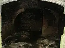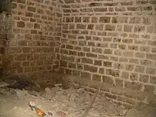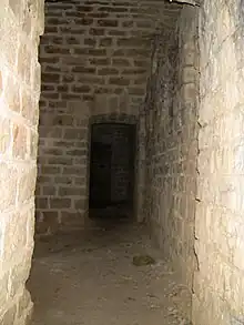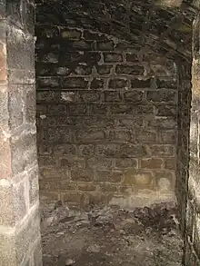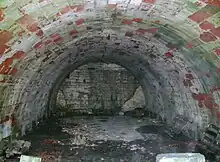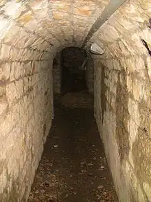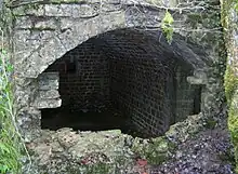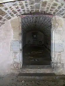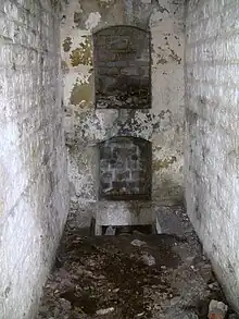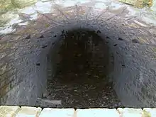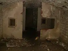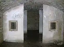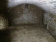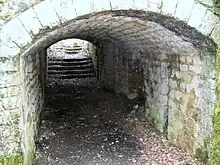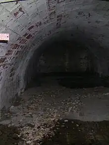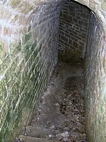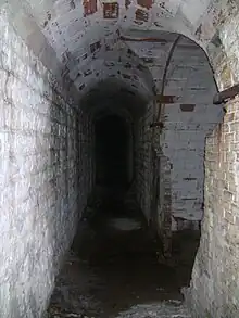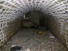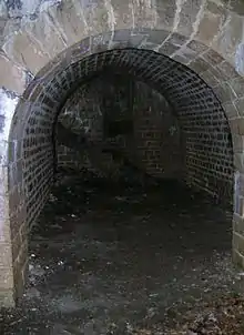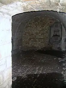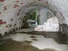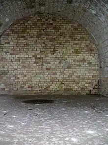 Un imposant puits à lumière, dont l'ouverture sommitale culmine à 10,50 mètres du sol et mesurant 6 × 2,5 mètres, est situé perpendiculairement à la cour et derrière les six ouvertures. Il amenait la lumière par une fenêtre située dans les deux magasins à poudre d'une dimension de 2 × 1,5 mètre[40]. Les locaux de stockage mesurant 12,5 × 6 mètres et ayant une contenance cumulée de 97 tonnes de poudre, possèdent une voûte en arc segmentaire[Note 6] alignant sur un même plan trois créneaux à lampe[40]. Entre ces magasins et le couloir de circulation est bâti un magasin à cartouches, ainsi que quatre auges en pierre appartenant à ce qui semble être une écurie[40]. Les dessus du réduit ne sont coiffés que de parapets d'infanterie qui ne sont pas organisés en position d'artillerie, et aucune rampe ne permet d'y mettre des canons[40]. Cependant, deux débouchés mènent à l'intérieur du fort, servant de point de communication entre les soldats postés au-dessus du fort et ceux en dessous ainsi que d'abris de parapet[41]. Chaque flanc du fort disposait également de deux banquettes d'infanterie[41],[Note 7]. Le couloir de circulation révèle au sol des traces de culot d'obus à certains endroits[40]. L'état de conservation général du fort est jugé satisfaisant par les spécialistes Marco Frijns, Luc Malchair, Jean-Jacques Moulins et Jean Puelinckx[40].