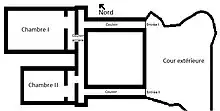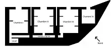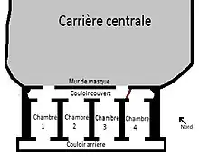 La batterie de mortiers de Planoise (parfois appelée également batterie centrale) est située au milieu du plateau que forme la place, à 480 mètres d'altitude[42]. Elle fut achevée en 1881, et elle est la seule batterie du genre car réalisée en fonction du mortier 200 mm de Bange MIe 1880 et MIe 1881[Note 8] ayant une portée maximale de 7 100 mètres, pouvant ainsi être fort utile même dans les angles morts formés par les méandres du Doubs[42]. Elle est composée d'une ligne paradossée[Note 9] de trois traverses-abris[Note 10] (chambre I, chambre II et chambre III) implantés parallèlement à une cinquantaine de mètres en avant de l'abri caverne de la carrière[42]. La chambre III est jouxtée par un local (chambre III bis) unique qui servait vraisemblablement au personnel, de dimension 4 × 3,5 mètres[42]. Les chambres II et III sont dissociées en trois parties cloisonnées percées de deux petites fenêtres[42], alors que la chambre I est quant à elle séparée en deux parties[42]. On note la présence d'un petit local au-delà du bras de la chambre I.