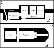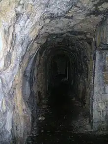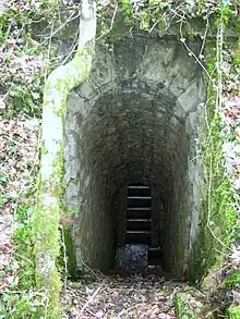 Le magasin de Planoise fut quant à lui bâti en 1889, à 450 mètres d'altitude[20]. Installé dans le roc, il est situé pratiquement sous la batterie nord-est, et sous le front de taille de la seconde carrière utilisée pour la construction des fortifications du plateau[20]. L'édifice se compose ainsi : une cour extérieure, deux accès parallèles, une galerie transversale ainsi que deux pièces de stockage[20]. Le bâtiment est jugé dans un excellent état malgré une soufflure[Note 14] de grande importance dans le couloir d'accès gauche, et il est libre d'accès[20].