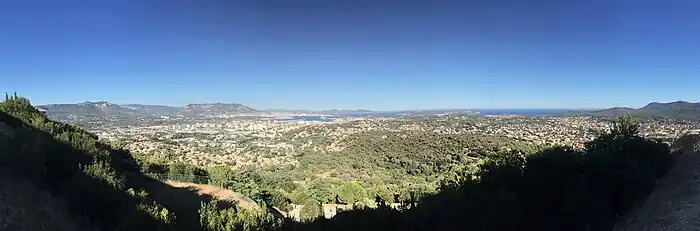 Situé à 200 m d'altitude, le fort pouvait abriter environ mille hommes et compte trente-deux pièces. C'est un grand pentagone irrégulier combinant des défenses terrestres placées face au débouché des gorges d'Ollioules et des défenses côtières pour parer à un débarquement au Brusc ou à Bandol. Il se distingue par sa caserne à neuf travées frontales et deux travées latérales plus étroites réparties sur quatre niveaux. Ce dispositif est le plus monumental de tout le système Séré de Rivières. Cette caserne est adossée au rocher et sa toiture arrive au niveau de la plate-forme supérieure du massif. Ce dernier supportait quelques maisons sur son sommet avant qu'il ne soit étêté pour la construction du fort.