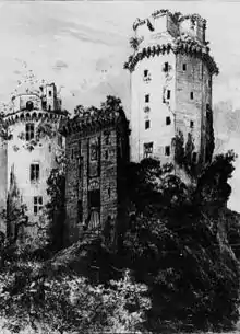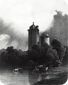 Vue du donjon et de la tour ronde depuis l'étang. | |