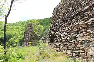 L'intérieur de la forteresse est divisé en deux zones, le plateau supérieur et le plateau inférieur[2],[3]. Deux citernes ont été découvertes sur le plateau supérieur ainsi que les ruines de trois petites salles[2],[3]. Une autre pièce plus petite de plan carré ainsi que les vestiges d'une église, dotée un plan cruciforme et terminée par une abside à trois pans, ont été découvertes sur le plateau inférieur[2],[3]. Les fouilles archéologiques ont également montré que la forteresse abritait des bâtiments en bois servant de logement[2],[3].