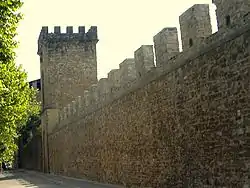 Un chemin de ronde continu longe les murs crénelés de merlons ; les mâchicoulis (piombatoi), trous d'où l'on peut verser de la poix ou de l'huile bouillante sur les ennemis sont nombreux[2].