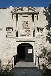La porte devait initialement comporter au-dessus des voûtes un logement pour l'état major mais après plusieurs arrêts et reprises dans sa construction, le lieutenant-général du royaume fit stopper les travaux, ne donnant à la façade intérieure que des colonnes à mi-hauteur. La porte principale présente aujourd'hui une façade, côté extérieur, sobre et massive, éloignée du projet initial et ne possédant pas le décor du projet présenté par M. de Tigné[25] en 1723. Le dispositif défensif comporte en avant de la porte principale une demi-lune. Le décor de la porte de la demi-lune se compose de 4 colonnes toscanes, d'un entablement et d'un fronton triangulaire. Le fronton est décoré d'un soleil entouré de cornes d'abondance.