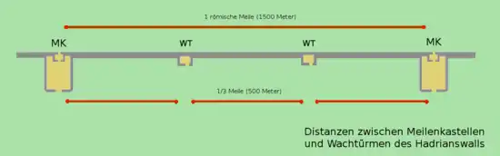 De part et d'autre de chaque milecastle se trouve une tourelle de pierre, située à environ 500 mètres (1/3 d'un mile romain).