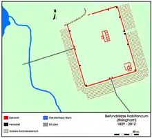 Le camp est entouré d'une muraille en pierre, arrondi aux angles et s'appuyant sur un fort talus descendant en pente douce à l'intérieur du camp, et un fossé profond à l'extérieur. Quatre tours de garde sont prévues aux angles ainsi que quatre portes donnant sur les deux axes. Les portes principales se trouvent sur les grands côtés. Des portes intermédiaires peuvent être ajoutées et des tourelles ponctuent à intervalle régulier la muraille. Les deux ouvertures principales sont pourvues de deux portes séparées par un pilier et sont flanquées par un corps de garde de part et d'autre. Elles sont fortement défendues.