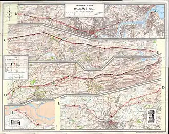 Sur le mur même, les seize principaux camps auxiliaires, les plus de quatre-vingt fortins (« MC », pour "milecastles", le mur faisant plus de 90 milles romains) ainsi que leurs deux tourelles associées ("associated turrets"), à 500 mètres de part et d'autre de chaque fortin ; à cela s'ajoutent quatre principaux camps sur la côte de la mer d'Irlande, en Cumbria, avec plus de vingt-cinq fortins (« MF », pour "milefortlet") et leurs tourelles associées ("associated tower", « Tn1 et Tn2 » avec le numéro du camp situé au nord) ; ainsi qu'un certain nombre d'autres camps auxiliaires, certains au-delà du mur au nord en avant-poste, d'autres en deçà du mur, sur la Stanegate et/ou d'approvisionnement.