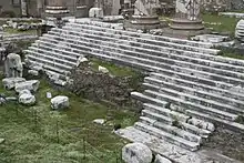 La place est bordée de deux colonnades d'ordre corinthien dont les fûts sont en marbre cipolin et les chapiteaux en marbre blanc de Carrare[20]. Elles supportent un entablement composé d'une architrave à trois bandes et d'une frise au décor végétal[21]. Au-dessus, un haut attique permet aux portiques latéraux de rivaliser avec la hauteur du temple[22]. Le sol des portiques, pavé de marbres colorés, une nouveauté pour un édifice public[23], est plus haut que le niveau de l'esplanade de trois marches. Il est possible que le portique ait eu deux étages comme le laisse penser les traces encore visibles aujourd'hui dans le mur du fond.