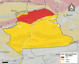 Les mouvements de terrains susceptibles de se produire sur la commune sont soit des chutes de blocs, soit des glissements de terrains, soit des effondrements liés à des cavités souterraines, soit des mouvements liés au retrait-gonflement des argiles. Près de 50 % de la superficie du département est concernée par l'aléa retrait-gonflement des argiles, dont la commune de Fougax-et-Barrineuf[44]. L'inventaire national des cavités souterraines permet par ailleurs de localiser celles situées sur la commune[45].
