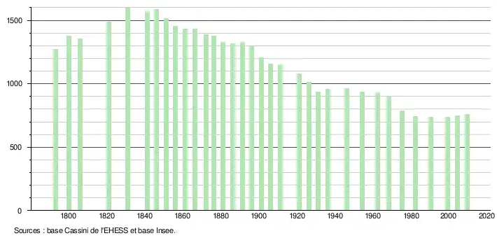 L'évolution du nombre d'habitants est connue à travers les recensements de la population effectués dans la commune depuis 1793. À partir du , les populations légales des communes sont publiées annuellement dans le cadre d'un recensement qui repose désormais sur une collecte d'information annuelle, concernant successivement tous les territoires communaux au cours d'une période de cinq ans. Pour les communes de moins de 10 000 habitants, une enquête de recensement portant sur toute la population est réalisée tous les cinq ans, les populations légales des années intermédiaires étant quant à elles estimées par interpolation ou extrapolation[32]. Pour la commune, le premier recensement exhaustif entrant dans le cadre du nouveau dispositif a été réalisé en 2004[33],[Note 1].