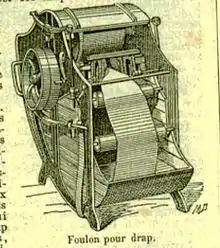 Dans les moulins à foulons les matériaux étaient battus par des maillets entraînés par la force motrice de l’eau. Des pilons verticaux avec des « masses » étaient mus soit manuellement, soit mécaniquement. Actuellement, on utilise des machines où le tissu passe entre des cylindres horizontaux animés d’un mouvement de rotation qui entraînent le drap plié en boudin en le comprimant.