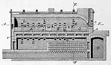 Coupe longitudinale d'un four à cuve Siemens (Dresde, 1878).