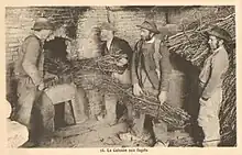 - Le bois utilisé pour chauffer ces fours est exclusivement du bois de bouleau. Sa combustion forte et rapide est uniforme, sa flamme est longue et il dégage peu de cendres. Ce bois est le seul capable de porter le four aux températures recherchées (petit feu vers 800 °C, grand feu vers 1300 °C). Ce four possède quatre foyers pour bien répartir la chaleur.