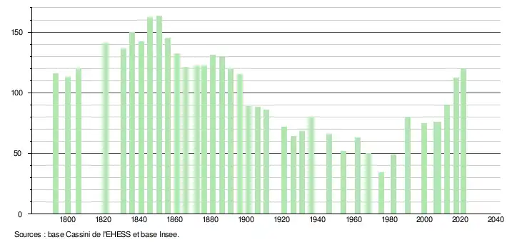 L'évolution du nombre d'habitants est connue à travers les recensements de la population effectués dans la commune depuis 1793. Pour les communes de moins de 10 000 habitants, une enquête de recensement portant sur toute la population est réalisée tous les cinq ans, les populations légales des années intermédiaires étant quant à elles estimées par interpolation ou extrapolation[17]. Pour la commune, le premier recensement exhaustif entrant dans le cadre du nouveau dispositif a été réalisé en 2007[18].