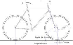 Chasse et empattement sont aussi influencés par l'angle de direction (ou angle de chasse) mesuré entre l'axe de direction et l'horizontale (pour les vélos) ou la verticale (pour les motos). Sur les bicyclettes, l'axe de direction est généralement plus vertical sur des modèles routiers (70 à 73°) que sur des VTT (62 à 70°)[41]. Sur les motos, l'angle peut aller de 22° sur des motos privilégiant la maniabilité[42] à 30° sur des cruisers visant le confort[43], et 38° ou plus sur des choppers[44].