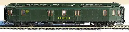 Voiture postale française de marque Jouef, format HO - les allèges postales, fourgons loués à la SNCF, destinés au transport des dépêches.